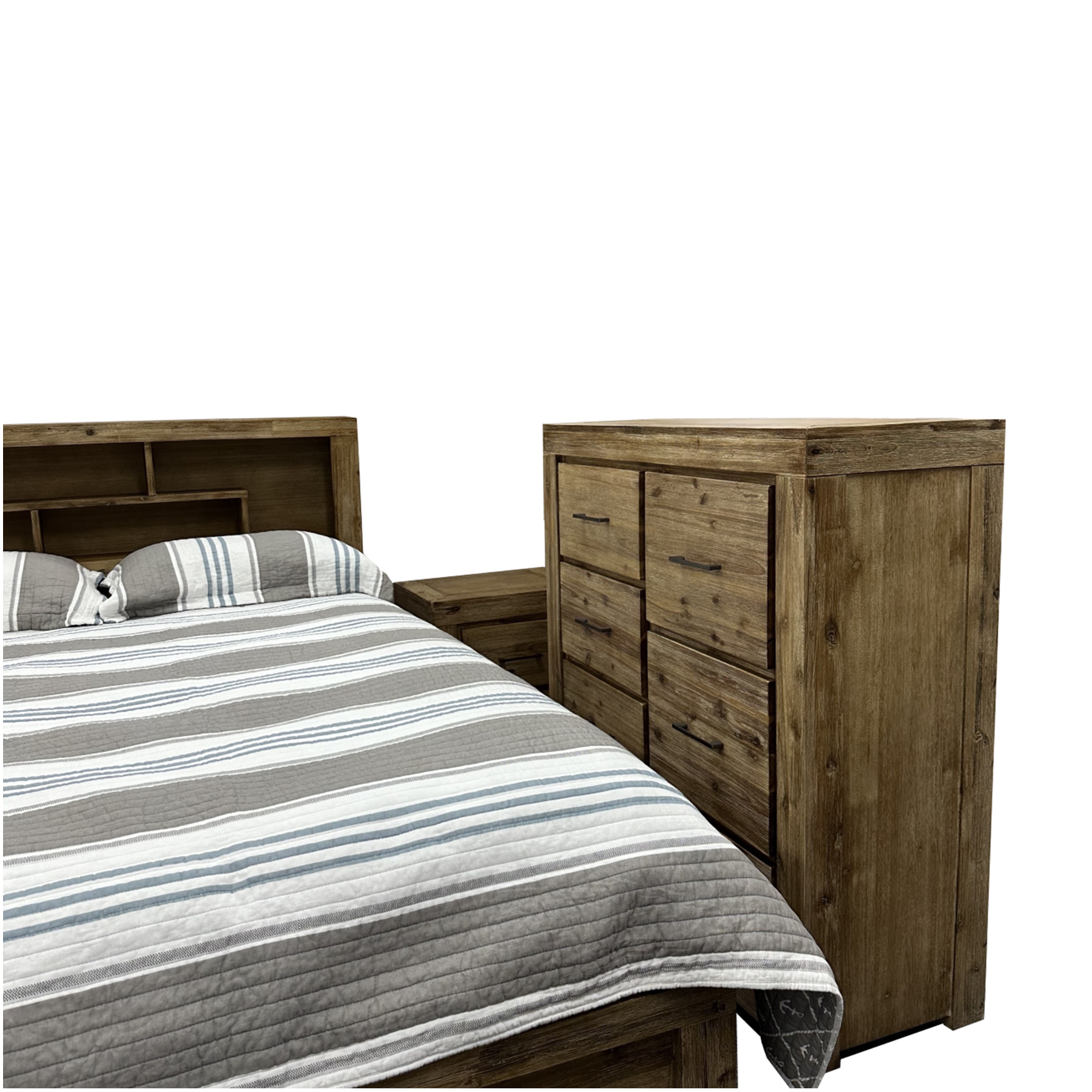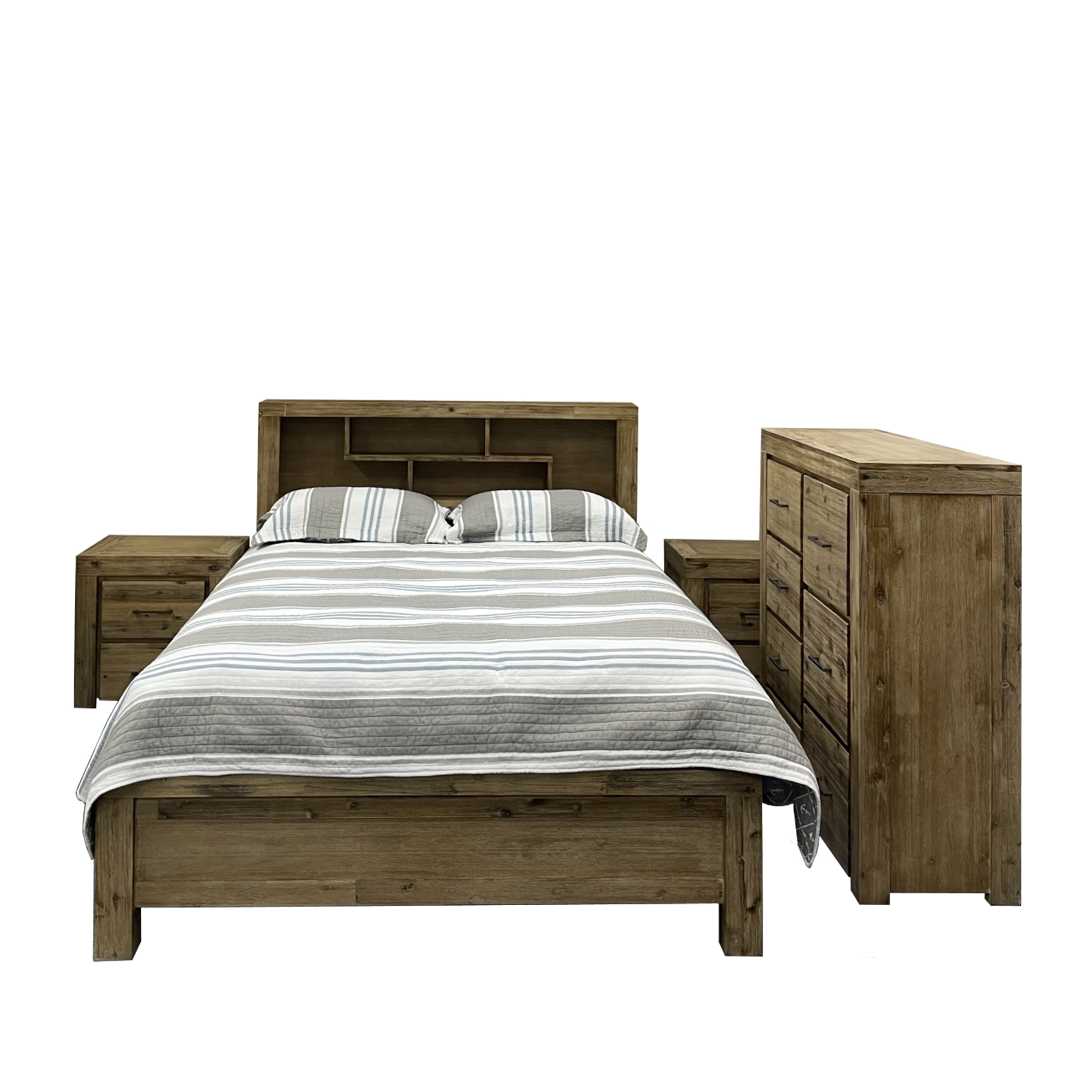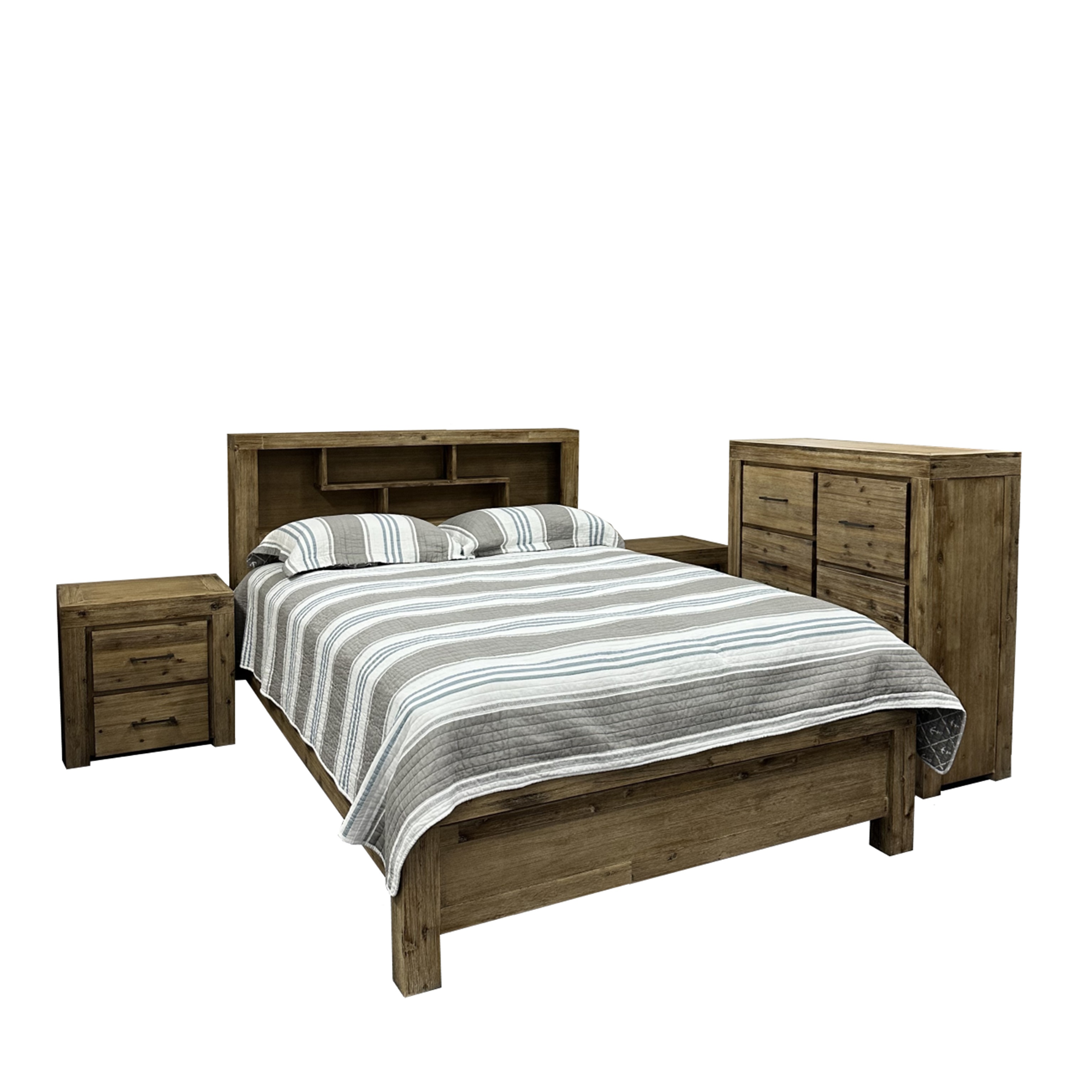 Experience the convenience and elegance of the Mi Casa 2 Bedroom Suite. The bookcase bed head and with a 2-draw foot option (Queen only), in a silver brush finish, provide ample storage space for all your belongings. Keep your room tidy and organized while adding a touch of style to your home. Additionally, the Queen bed comes in a drawer foot option, giving you an extra 2 drawers of storage space.