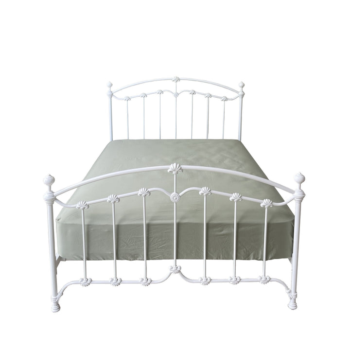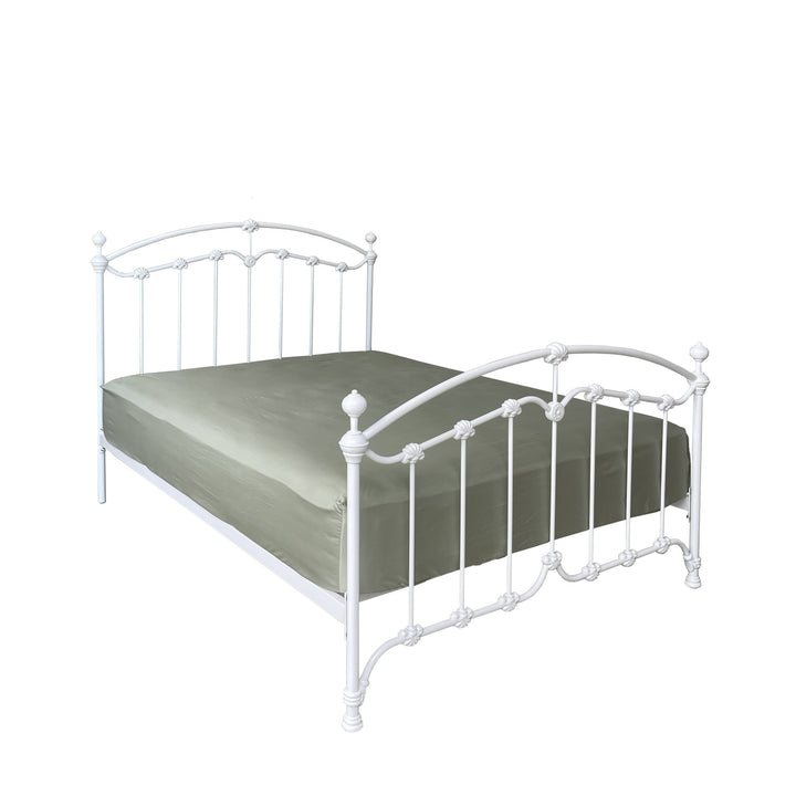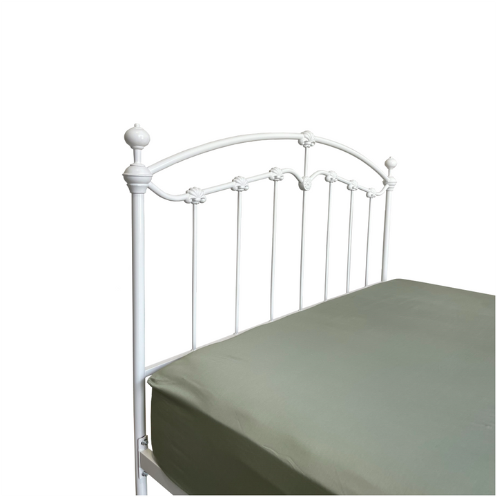 Indulge in the enduring charm of The Katrina Bed, crafted with striking cast and wrought iron details. Its robust frame is engineered to stand the test of time.